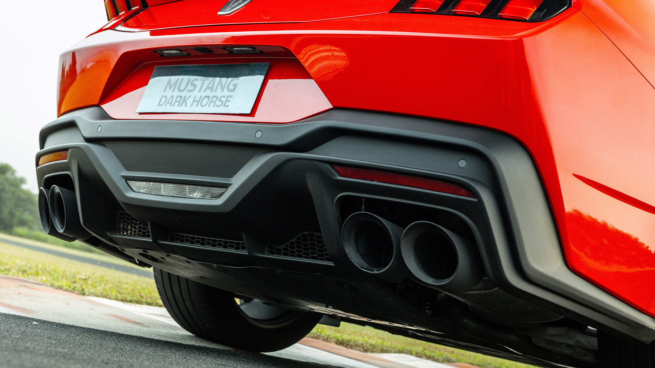 Essa impressão é reforçada pelo emblema Dark Horse aplicado nas laterais, na traseira e nas soleiras, o primeiro em que o cavalo é visto de frente. Com olhar fixo e narinas abertas, ele encara o observador de modo desafiador. O logo tradicional do cavalo, em versão escurecida, foi mantido na grade dianteira. As pinças de freio pretas exibem os logos Brembo e Mustang.