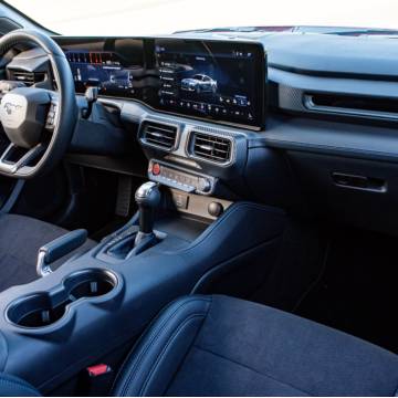 A cabine do Mustang Dark Horse é totalmente centrada no motorista, no estilo cockpit, com fácil acesso às informações e comandos para a pilotagem. O painel de instrumentos digital de 12,4” configurável forma um conjunto integrado com a tela de 13,2” da central multimídia. Além de conexão sem fio com Android Auto e Apple CarPlay e GPS embarcado, ela vem com sistema de som premium da B&O e 12 alto-falantes.